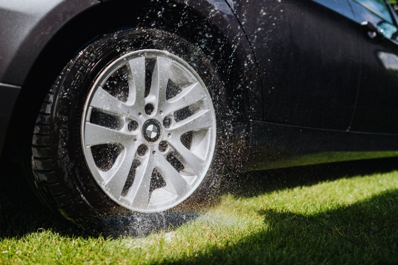 Water being Sprayed on a Wheel of a Car Stock Photo">